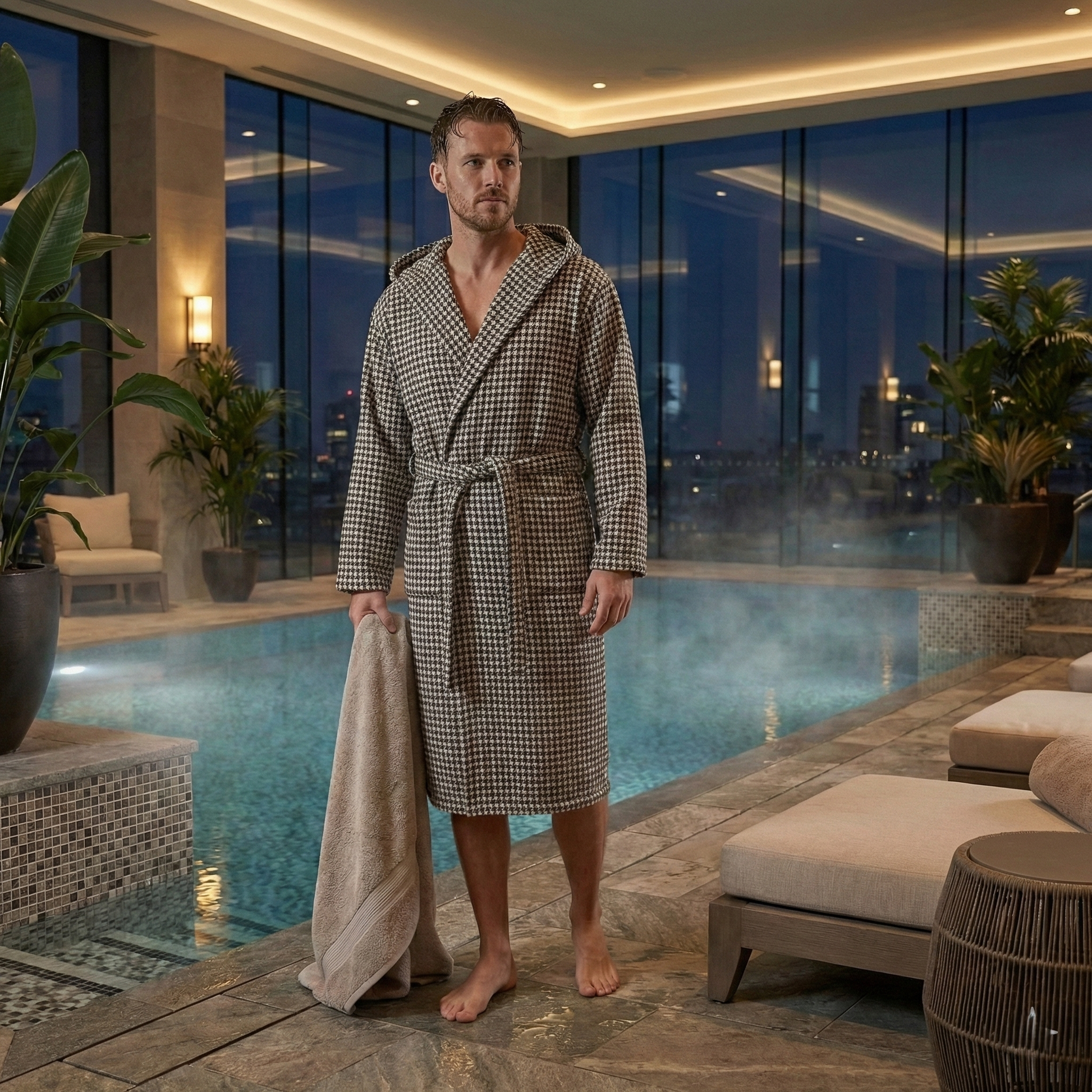 With its front patch pockets, hood, and generous under-knee length, this trendy bathrobe is incredibly cozy. Except in humid conditions, extra-thick robes dry easily and absorb water well. Its contemporary style produces appropriate clothing for lounging at home.
