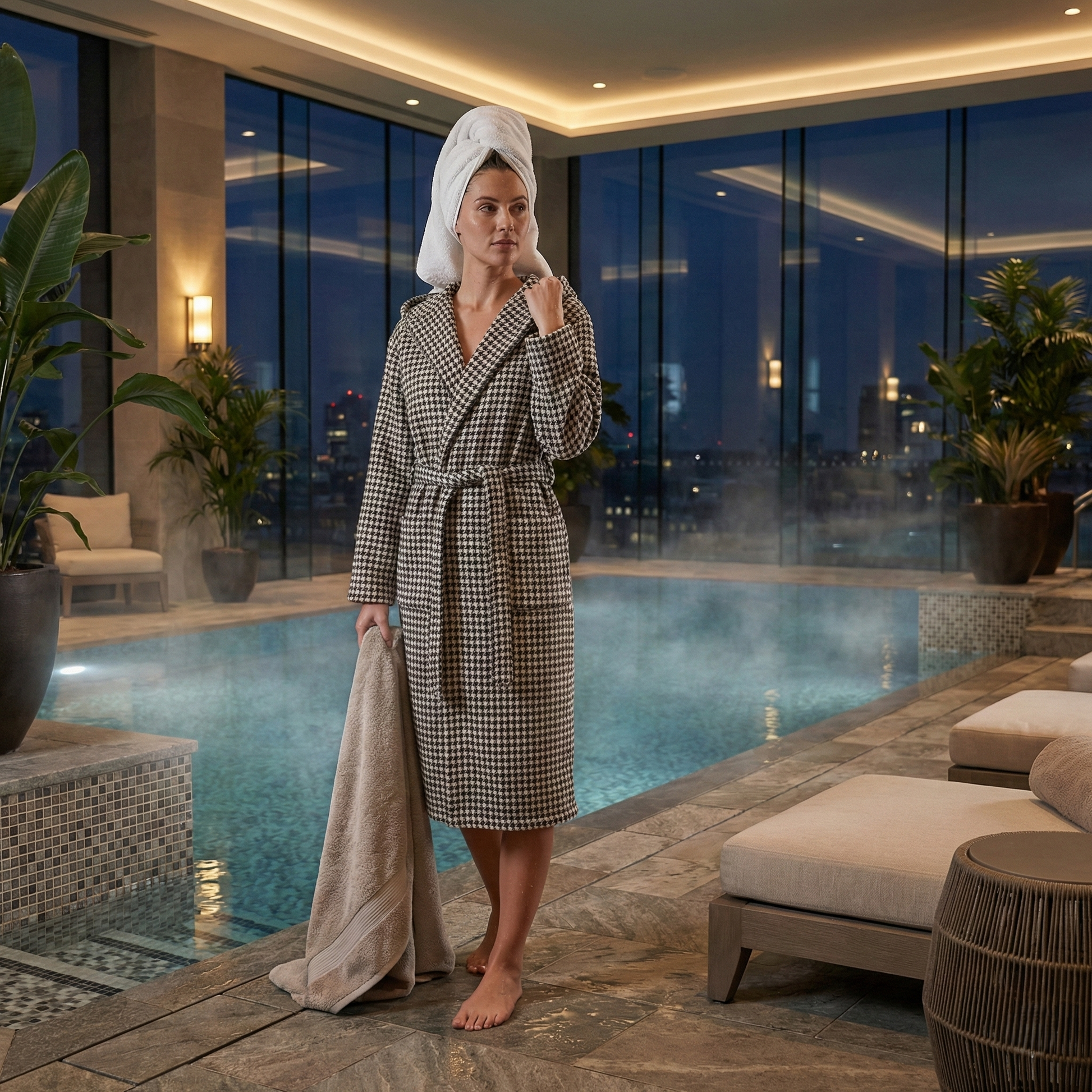 This Turkish Terry Towel Bathrobe has a modern Black and White design that you can match with Black and White Bath towels and Black and White Hand towels.