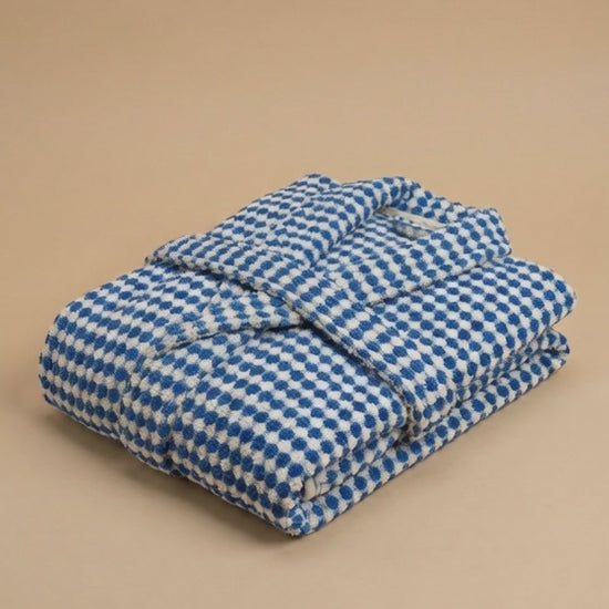 Turkish Terry Towel Unisex Bathrobe Indigo Dotted Pompom Design Hooded