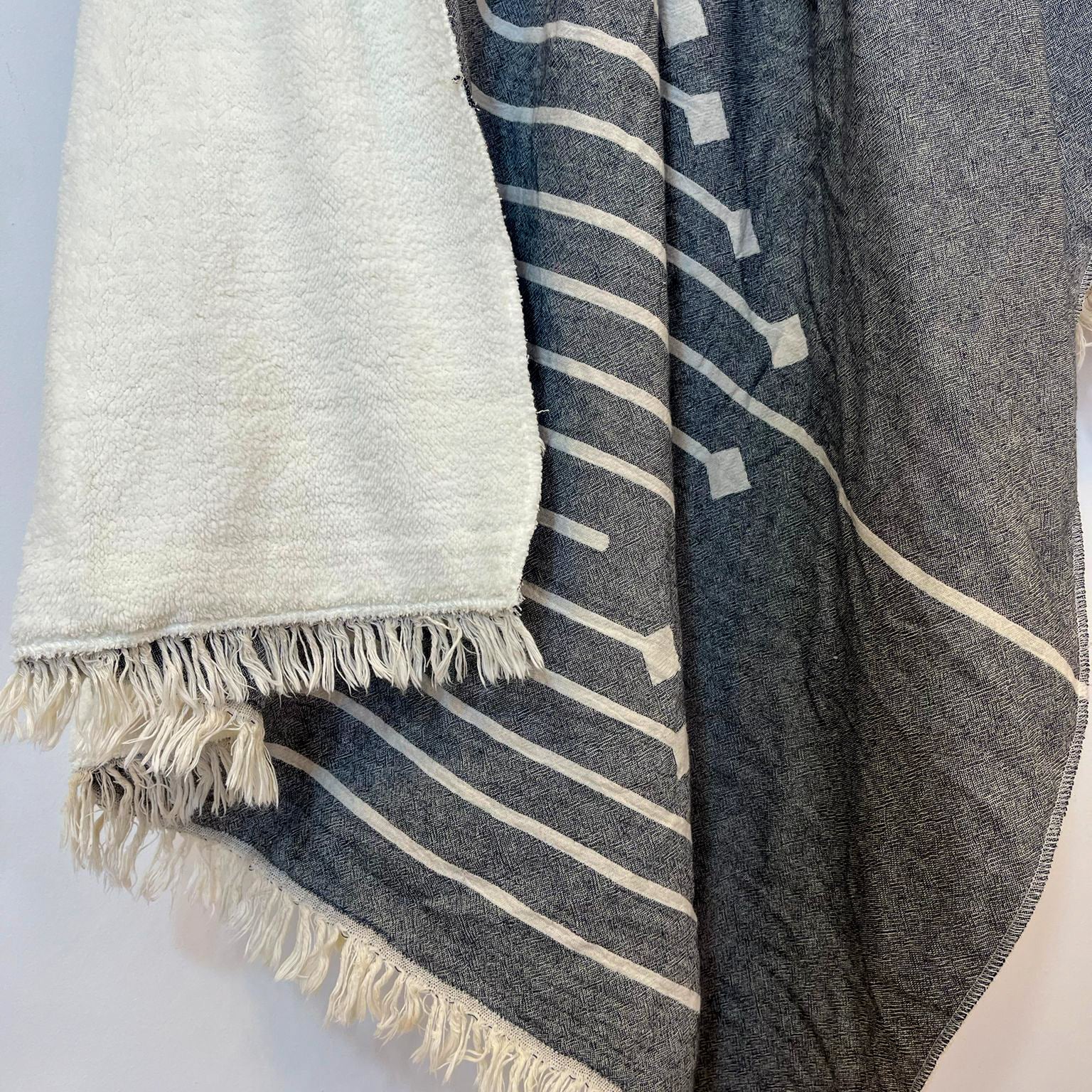 One layer is made of %100 Natural Cotton Turkish Towel Throw, the other side is a cozy&soft well soft blanket.
